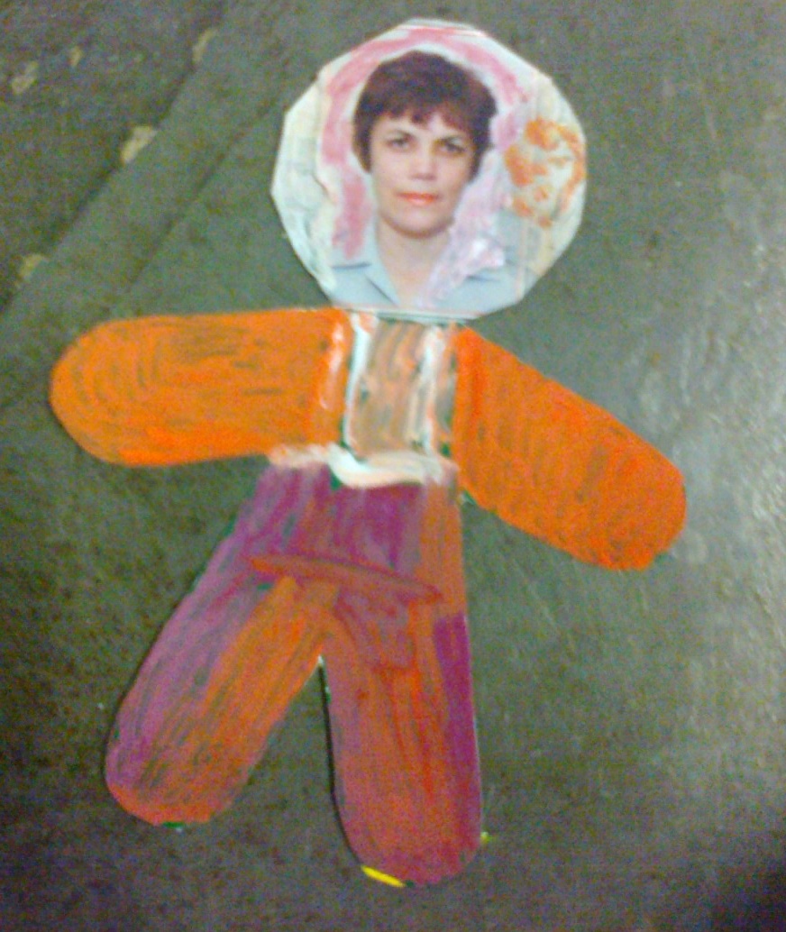 Propomos aos idosos que procurassem nas revistas uma figura apenas, não muito grande, que representasse algo que gostassem muito. A seguir os idosos colaram essa imagem em um boneco de papel cartão. Dissemos que cada um daqueles bonecos era a representação deles próprios. A fisioterapeuta Aline Poli falou também da importância de cada parte do corpo em nossa vida. A ideia foi que cada um tivesse a oportunidade de pensar um pouco mais em si mesmo.